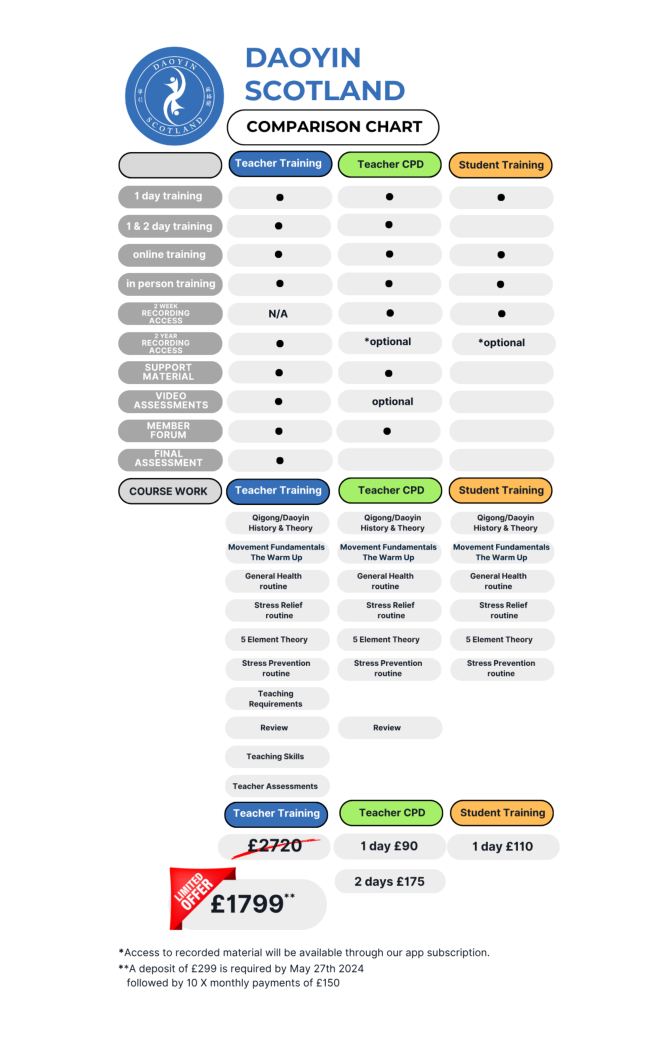 Tobecomealevel1DaoyinScotlandQigonginstructor,we want to give you as much quality support as possible.Theabovedatesarethecoredates.Forapplicantswho cannotmakeevery'inperson'weekend,onlinedateswill beaddedlater.Wearededicatedtoyourprofessionaland personalQigongdevelopment,andsorecordingsofall onlinecontentwillbemadeavailablefor2years.Aswill accesstoadedicatedstudentforumandprofessional support.Therewillbecontinuedassessmentandthefinal assessments will be 'in person', dates yet to be finalised.Ifyoualreadyhavetrainedextensivelywithus,theremay bediscountsavailable.Pleasegiveyourprevious experience on the application form.Allapplicantsrequireaminimumof3yearsofcontinued practiceinChineseinternalmovementarts(similar equivalentswillbeconsidered).Itisadvisedthatyoutake upregularclasseswithusoroneofourinstructorsto maintain good practice and guidance.£2800Standardcourseand2yearsupport(pleaseapply to see if you qualify for discounts).£300non-refundabledepositrequireduponsuccessful application.PleasebearinmindthatyourawardofLevel1Daoyin ScotlandQigongInstructorcertificateissubjectto successfulassessmentafterallmoduleshavebeen completed.