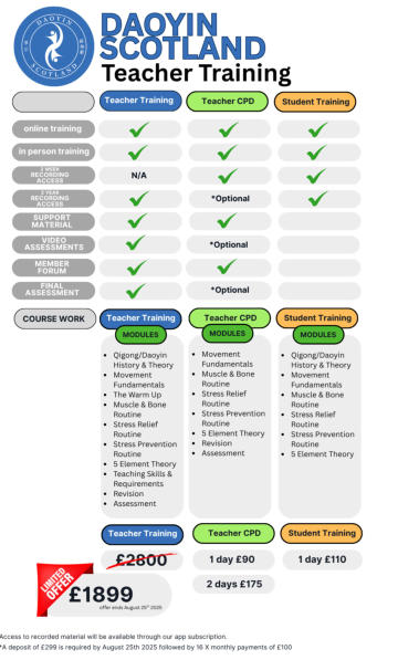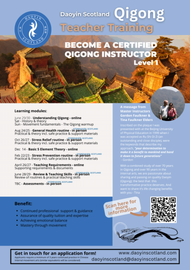 Tobecomealevel1DaoyinScotlandQigonginstructor,wewanttogiveyouasmuch quality support as possible.Theabovedatesarethecoredates.Forapplicantswhocannotmakeevery'inperson' weekend,onlinedateswillbeaddedlater.Wearededicatedtoyourprofessionaland personalQigongdevelopment,andsorecordingsofallonlinecontentwillbemade availablefor2years.Aswillaccesstoadedicatedstudentforumandprofessional support.Therewillbecontinuedassessmentandthefinalassessmentswillbe'in person', dates yet to be finalised.Ifyoualreadyhavetrainedextensivelywithus,theremaybediscountsavailable. Please give your previous experience on the application form.Allapplicantsrequireaminimumof3yearsofcontinuedpracticeinChineseinternal movementarts(similarequivalentswillbeconsidered).Itisadvisedthatyoutakeup regularclasseswithusoroneofourinstructorstomaintaingoodpracticeand guidance.£2800Standardcourseand2yearsupport(pleaseapplytoseeifyouqualifyfor discounts).£300 non-refundable deposit required upon successful application.PleasebearinmindthatyourawardofLevel1DaoyinScotlandQigongInstructor certificate is subject to successful assessment after all modules have been completed.